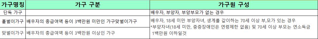· 가구원 구성에 따라 거주자(배우자 포함)의 연간 총소득 기준금액이 다음표의 미만이어야 합니다.