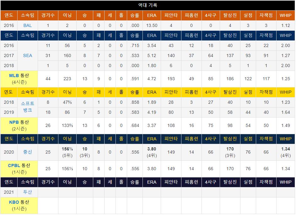 두산 베어스는 지난 시즌이였던 2020년 프로야구 시즌에서 놀라운 활약을 보여주면서 마운드를 지켜주었던 라울 알칸타라 선수와 크리스 플렉센 선수가 두산 베어스와 재계약을 체결하지 않고, 한신 타이거스와 시애틀 매리너스로 이적하게 되면서 대체선수로 메이저리그, 일본 프로리그, 대만 프로야구리그를 모두 경험한 아리엘 미란다 야구선수를 영입하였습니다.