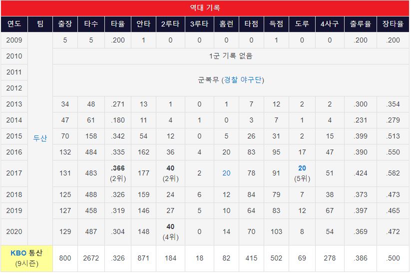 박건우 야구선수가 높은 평가를 받는 이유 중 하나는 단순하게 타율만 높은 선수가 아니기 때문입니다. 두산 베어스 박건우 야구선수는 득점권 타율과 시즌 타율이 큰 차이를 보이지 않을 뿐더러, 장타율도 높아 팀내 득점 생산력이 압도적으로 높은 선수입니다.