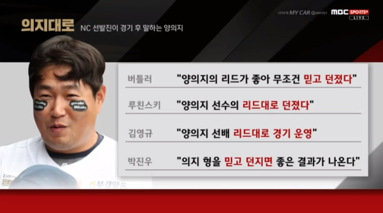 FA 계약을 통해 2019년 시즌부터 두산 베어스 유니폼이 아닌 NC 다이노스 유니폼을 입게된 양의지 야구선수는 이적한 2019년 시즌에 NC 다이노스 4번 타자로 경기에 출장하면서 부진하였던 외국인선수들 그리고 나성범 야구선수의 시즌 아웃이라는 위기 속에서도 혼자 하드캐리하며 팀을 이끌며, 상위권 성적을 유지하였습니다.