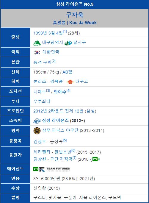 삼성 라이온즈 구자욱 야구선수는 대구광역시 달서구 출신으로 나이는 1993년 3월 4일 생으로 만 28세입니다. 구자욱 야구선수 키는 189cm이고 몸무게는 75kg으로 팀 내에서 외야수 포지션으로 활동하고 있습니다. 대구고등학교를 졸업하고 2012년 KBO 신인 드래프트 2라운드, 전체 12번으로 삼성 라이온즈의 지명을 받아 프로구단에 입단하였습니다.