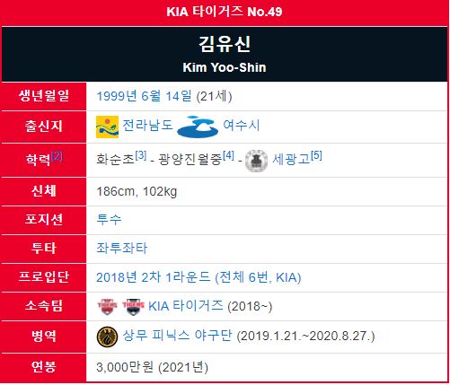 KIA 타이거즈 김유신 야구선수는 전라남도 여수시 출신으로 나이는 1999년 6월14일 생으로 만 21세입니다. 김유신 야구선수 키는 186cm이고 몸무게는 102kg으로 좌완투수입니다. 세광고등학교를 졸업하고 2018년 KBO 신인 드래프트 2차 1라운드, 전체 6번째로 KIA 타이거즈의 지명을 받아 입단하게 되었습니다.