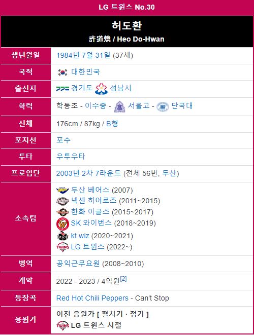 LG 트윈스로 이적하게된 허도환 야구선수는 경기도 성남시 출신으로 나이는 1984년 7월 31일 생으로 만 37세입니다. 허도환 야구선수 키는 176cm이고 몸무게는 76kg, 포수 포지션으로 활동하고 있습니다. 2003년 KBO 신인 드래프트 2차 7라운드, 전체 56번으로 두산 베어스에 지명을 받았습니다.
