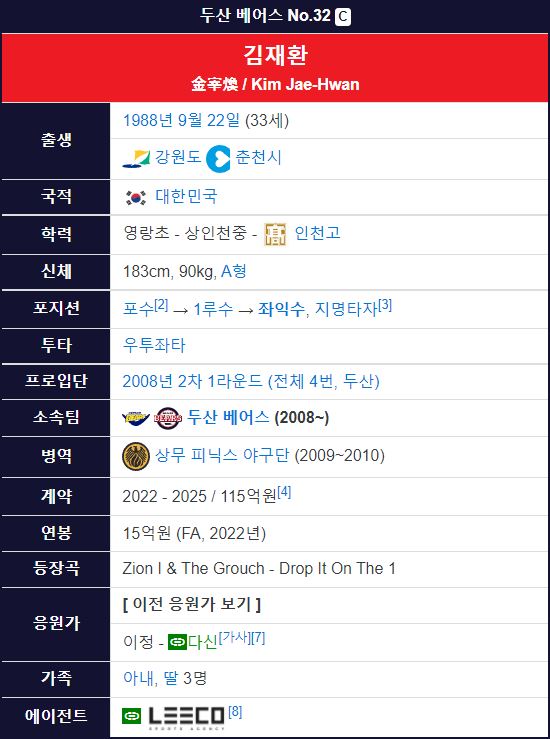 두산 베어스 김재환 야구선수는 강원도 춘천시 출신으로 나이는 1988년 9월 22일 생으로 만 33세입니다. 키는 183cm이고 몸무게는 90kg으로 팀 내에서 1루수와 좌익수로 활동하고 있습니다. 2008년 KBO리그 신인 드래프트 2차 1라운드, 전체 4번으로 두산 베어스에게 지명받아 입단하게 되었습니다.