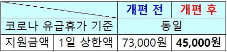 격리 근로자에게 유급휴가를 준 사업주가 정부에서 일정부분 경제적인 지원을 받는 코로나 유급휴가 지원금 지원사업도 생활지원비와 마찬가지로 개편으로 하향 조정되었습니다. 개편 전 코로나 유급휴가 지원금 1일 상한액은 73,000원에서 개편 후 1일 상한액 45,000원으로 인하 되었습니다.
