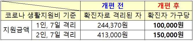 개편 전 코로나 생활지원비는 1인, 7일 격리 시 244,370원을, 2인 7일 격리 시 413,000원을 지원받을 수 있었습니다. 하지만, 개편 후에는 1인, 7일 격리 시 100,000원을, 2인 이상 7일 격리 시 150,000원을 지원받게 되었습니다. 기존의 코로나 생활지원비 지원금액과 비교하면 60%이상 하향된 금액입니다.