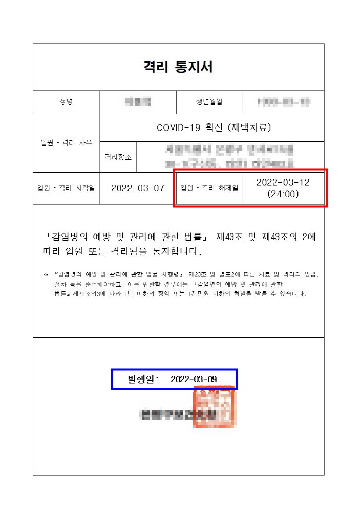 코로나 생활지원비 신청기간은 격리 해제일로부터 3개월 이내입니다. 격리 해제일 기준은 해당 관할 보건소에서 보내주는 격리통지서에 입력된 입원, 격리 해제일을 기준으로 하게 됩니다.