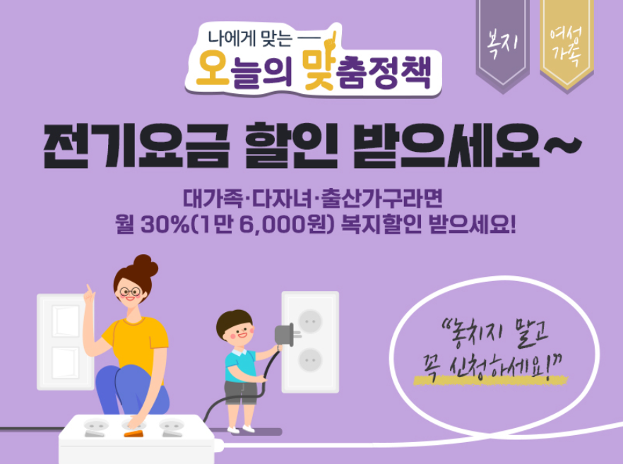 한국전력공사에서 출산가구를 위한 전기요금 감면 정책인 신생아 출산 전기세 감면 정책을 시행하고 있습니다. 신생아 출산 전기세 감면은 아이를 키우는 가구의 주택용 전기요금을 매월 1만 6천 원 최대로 30% 할인해 주는 혜택을 주고 있습니다.