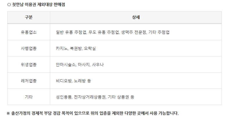 출산 가정의 경제적 부담을 경감하는데 목적을 가지고 있는 첫 만남 이용권이기에 아이에게 사용하는 업종을 제외하면 사용처 제한이 없습니다.
