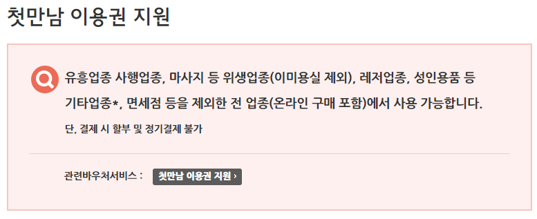 첫 만남 이용권 혹은 첫 만남 바우처 사용처 사용 시 온라인과 오프라인 모두 사용가능하지만, 할부 혹은 정기결제와 같은 방법으로는 사용할 수 없습니다.