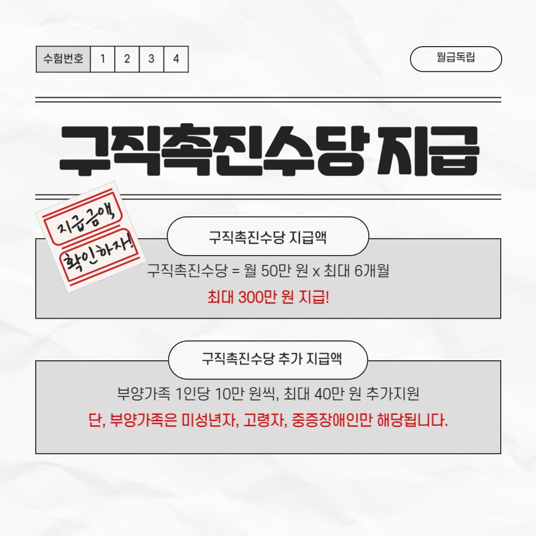 구직촉진수당은 월 50만 원씩 최대 6개월을 기본적으로 지원받을 수 있고, 부양가족 1인당 10만 원씩, 최대 40만 원을 추가지원받을 수 있습니다. 부양가족에는 미성년자(만 18세 이하), 고령자(만 70세 이상), 중증장애인이 포함됩니다.