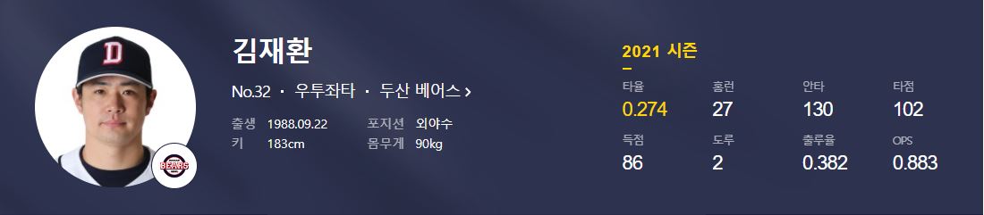 그리고 두산 베어스 김재환 선수는 2021년 또한 27개의 홈런을 기록하면서 7년 연속 두 자리수 홈런이라는 대 기록을 이어가고 있습니다. 2021년 프로야구 시즌 김재환 성적은 475타수 0.274타율 27홈런 130안타 102타점 86득점 2도루 0.382출루율 0.883OPS입니다.